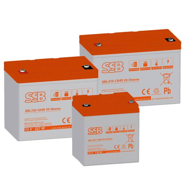 Die SBL-HR Xtreme-Serie umfasst verschlossene und absolut wartungsfreie AGM-Batterien mit extrem hohen Entladeraten und 30 % mehr Hochstromleistung bei bis zu 35 % geringerem Platzbedarf (im Vergleich zur SBL-HR-Serie).
